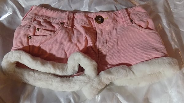 MA*RS MARS Gyaru Sugar Gloss Light Pink Faux Fur Mini Shorts. Second hand but not worn by me. On the tag it says 24 so I am assuming it's a size small but it looks like a medium. It is 14 inches in waist and 8 1/2 in length. The bottom has faux white fur. The back has heart shaped pockets with hot pink ribbons and light pink lace with MA*RS written in gold on them.