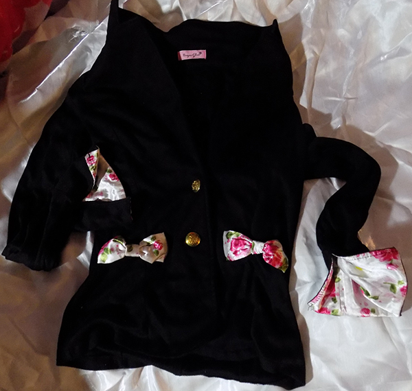 MA*RS MARS Gyaru Sugar Gloss Black Blouse. Second hand but not worn by me. This blouse has gold buttons on the front. There's white bows on the front with pink flowers on them. When you roll the sleeves back, there's more floral on it.