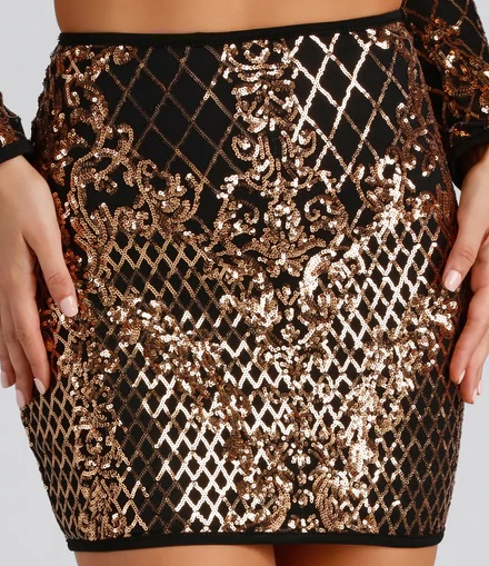 You'll be the life of the party in this glitzy embroidered mini skirt! It features a high waist and a short, form-hugging fit. The sheer mesh fabric includes a knit lining and all-over sequin embroidery in a chic geometric pattern. Style this skirt with the matching crop top.